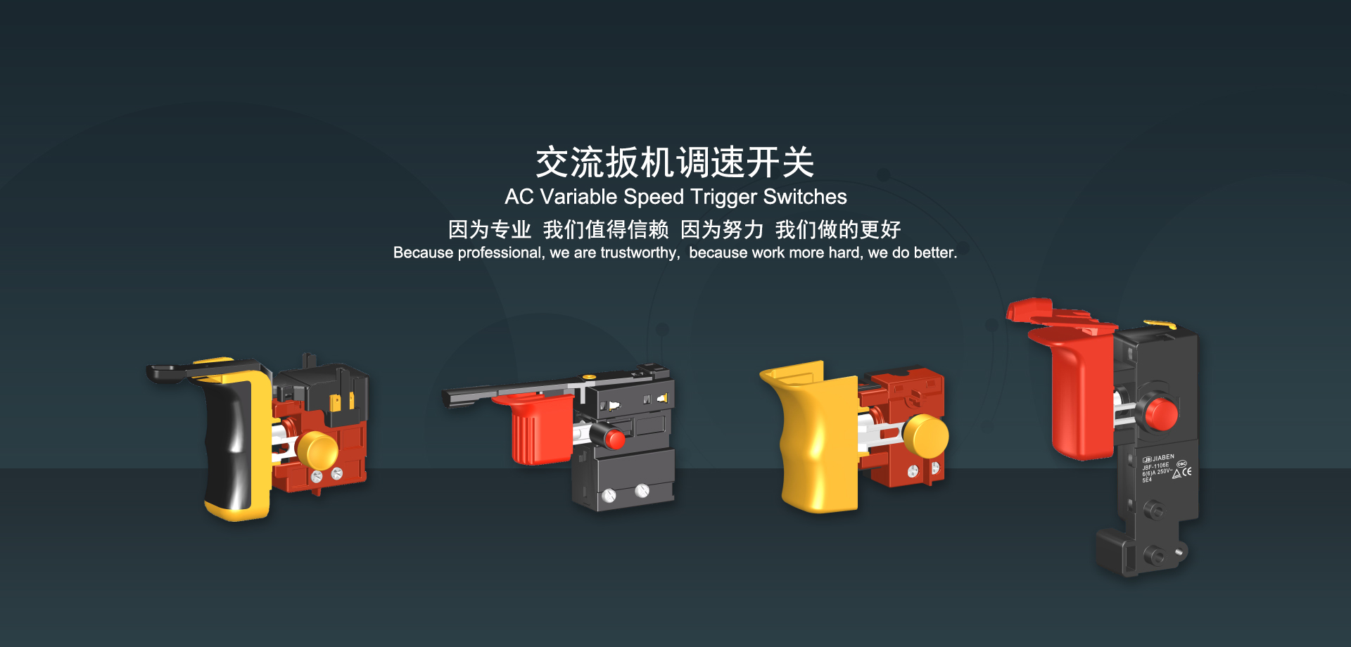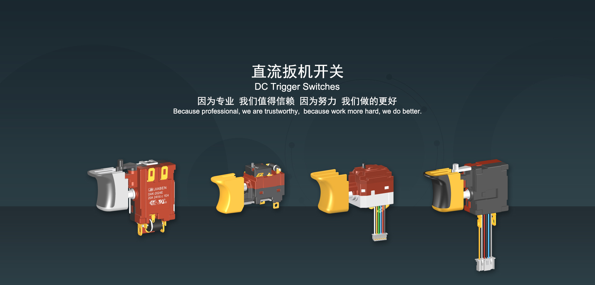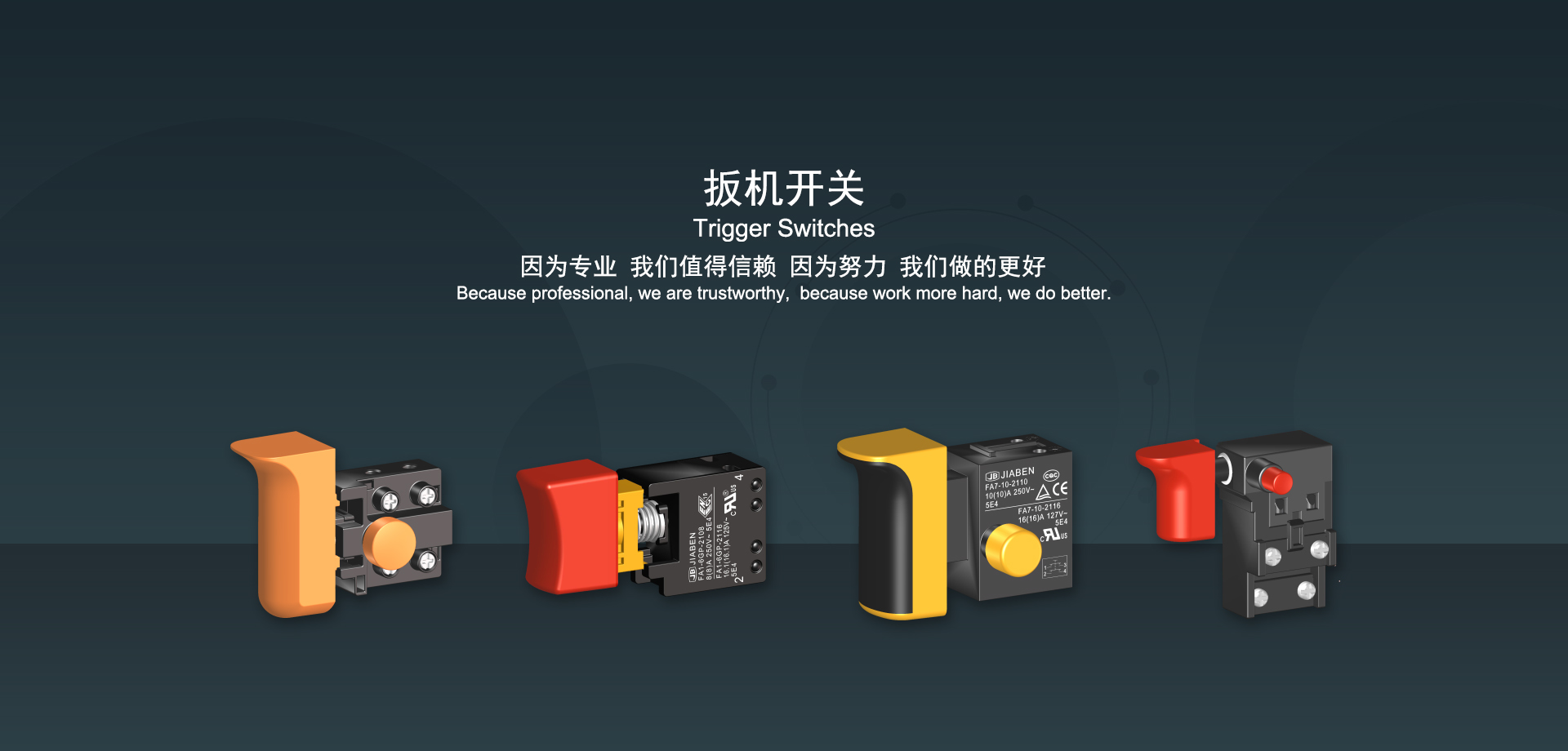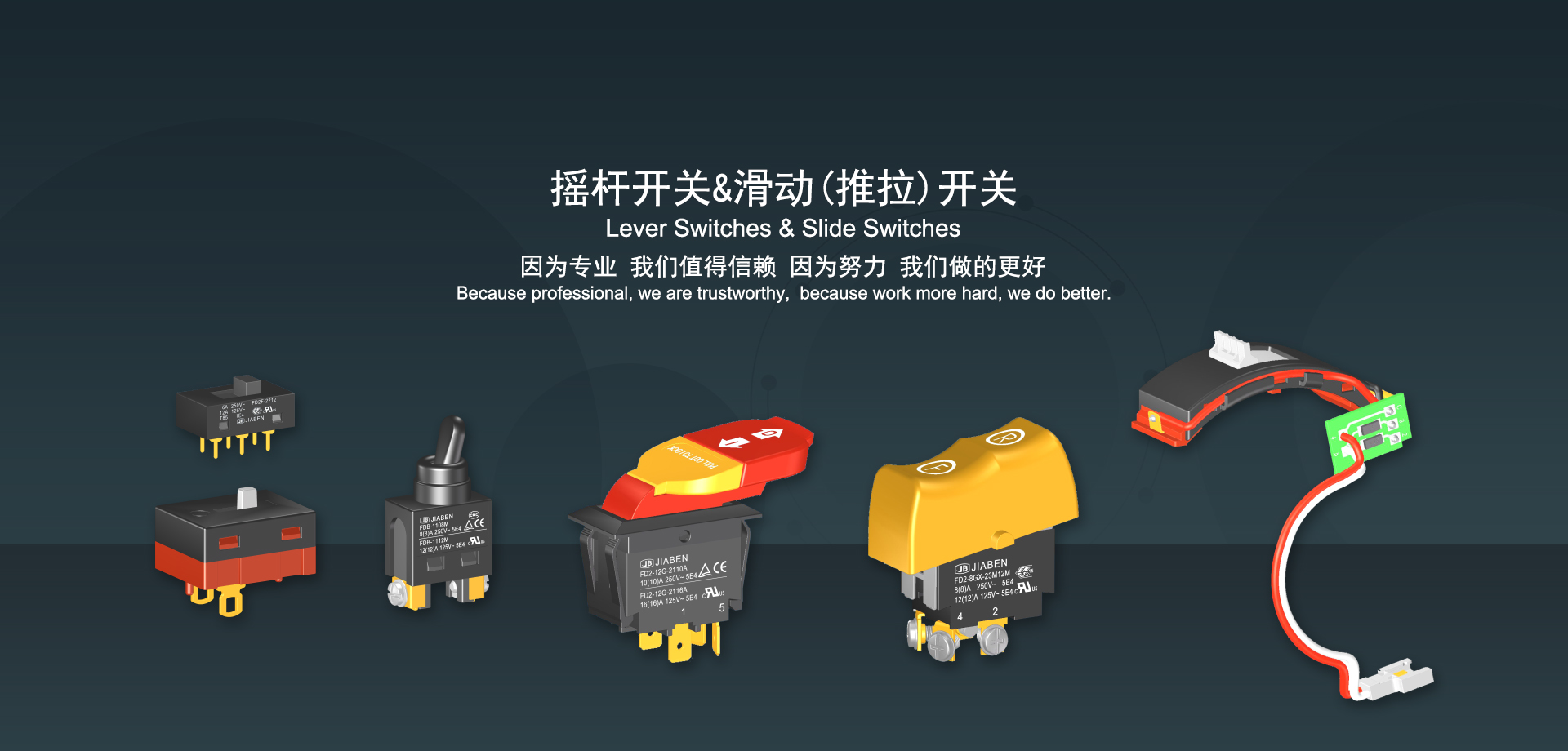 浙江佳奔電子有限公司始建于1986年,坐落于浙江省樂清市虹橋鎮(zhèn)東電子信息產(chǎn)業(yè)園內(nèi),現(xiàn)有職工700多人,資產(chǎn)總額超3億元。公司主要經(jīng)營“JIABEN”牌微動開關、蹺板開關、按鈕開關、扳機開關、調(diào)速開關和電位器開關等各類交、直流器具開關和各類交、直流線路板模塊等產(chǎn)品,主要應用于交、直流電動工具、電動園林工具、清潔器具、家用電器和小型機床等行業(yè),是集產(chǎn)品設計、研發(fā)、制造、銷售和服務于一體的國家高新技術(shù)企業(yè)。JIABEN was founded in 1986, located in East Electronic Information Industry Park, Hongqiao Town, Yueqing City, Zhejiang Proviance, existing staff more than 700 peoples, more than 300 million RMB worth of assets. Company is mainly engaged in "JIABEN" brand Micro Switch, Rocker Switch, Push-button Switch, Trigger Switch, Speed Regulating Switch, Potentiometer Switch and other kinds of appliance switch and all kinds of AC or DC circuit board module, such as more than 100 series, 8000 kinds of models of products, mainly used in AC or DC Power-tools, Power Gardening Tools, Cleaning Appliances, Household Appliances and Small Machine Tool and other industries, is the collection product design, research and development, manufacturing, sales and service in one of the national high and new technology enterprise.